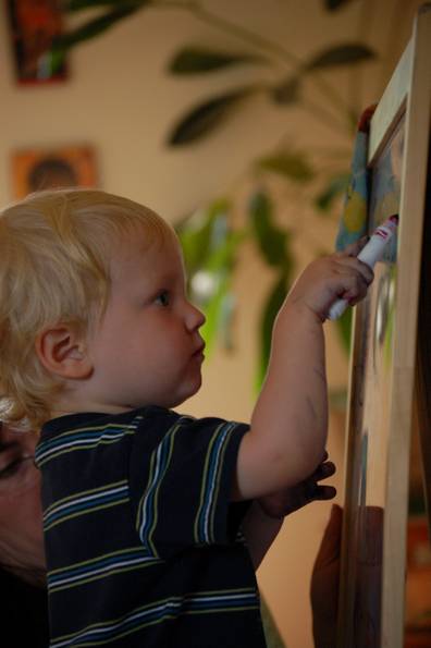 Forget all the other things we've bought him - the easel is the best. It does mean that most of our house is covered with marker, but it sure keeps him busy.