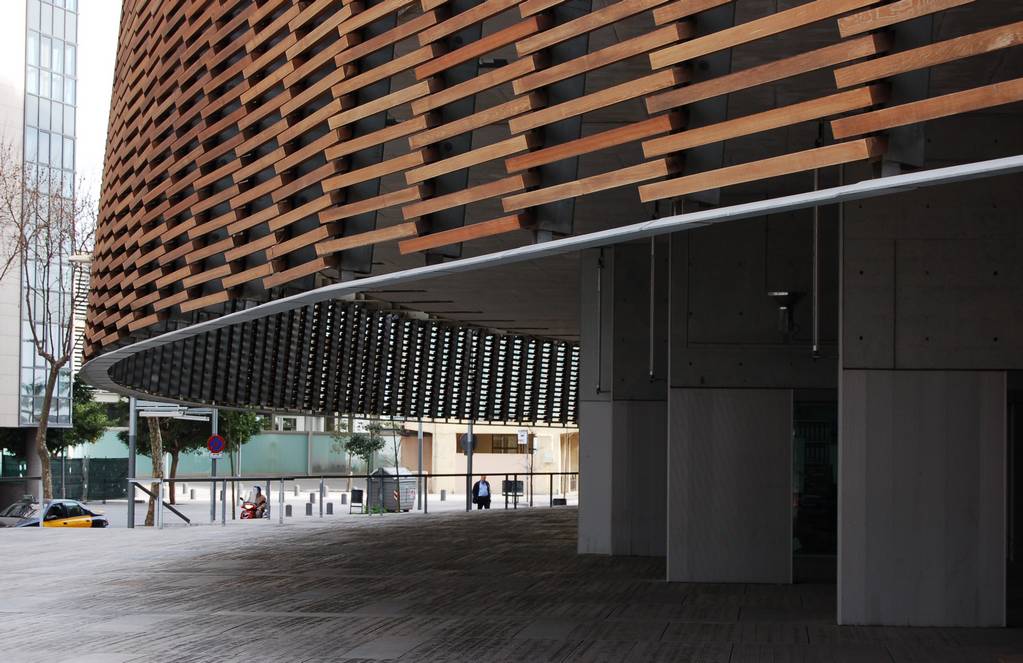 The whole exterior of the building is made up by slats of wood.