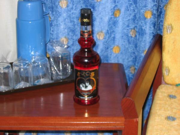 It's too bad it's not in focus, but this is a bottle of "Eros: Liqor de l'Amor". It was waiting for us on the table when we checked in. It tasted like cherry cough syrup and made us both gag a little.