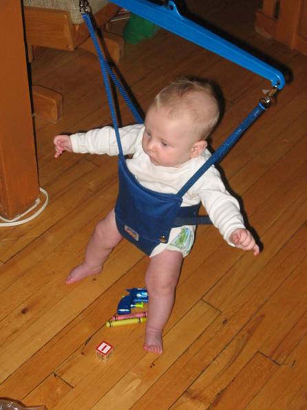 He was loving his Jolly Jumper, but he couldn't understand the concept of "hold the toys once you've got them".