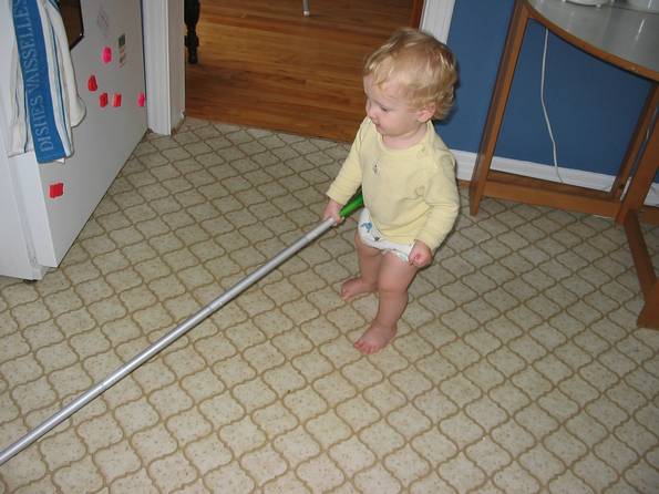 We're starting small with sweeping the kitchen. By next month we hope to have him up to drywalling and sewing Gucci knockoff wallets.