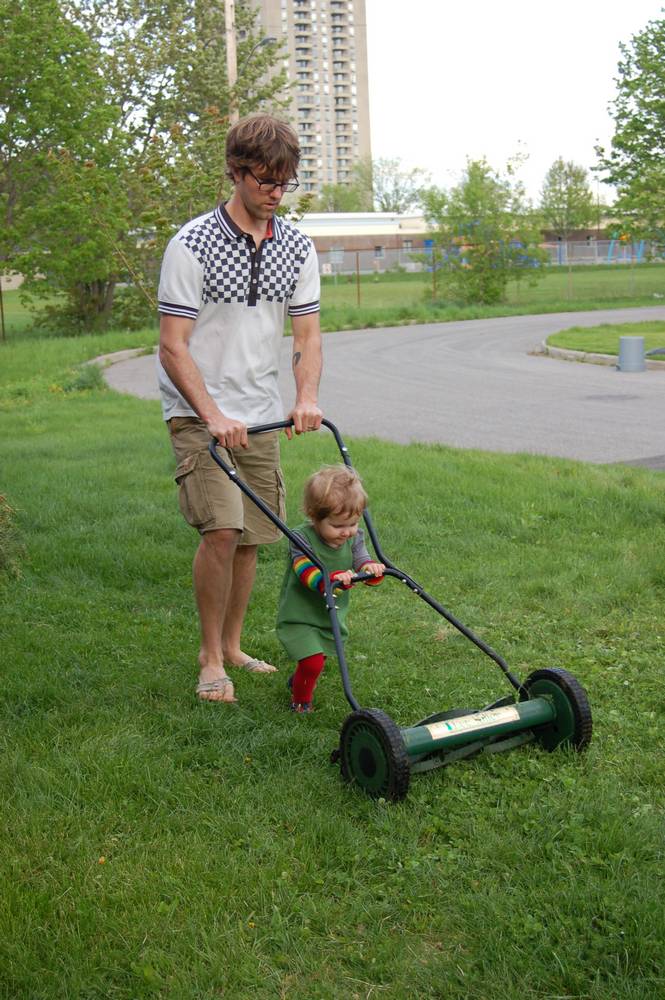 Don't drop the baby in the lawnmower, don't drop the baby in the lawnmower.... And yes, those are steel toed flip-flops I'm wearing.