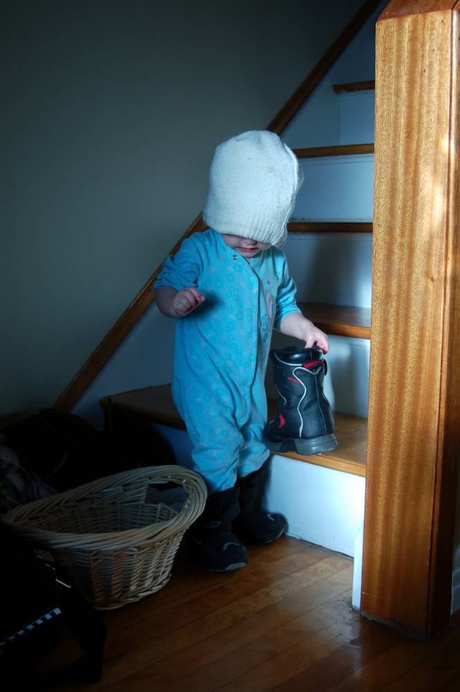 Mom's hat, brother's boots and pyjamas. The little miss is ready for the outdoors.