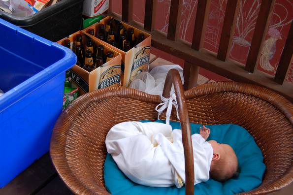 Who needs a teddy bear when you've got recycling and empty beer bottles?