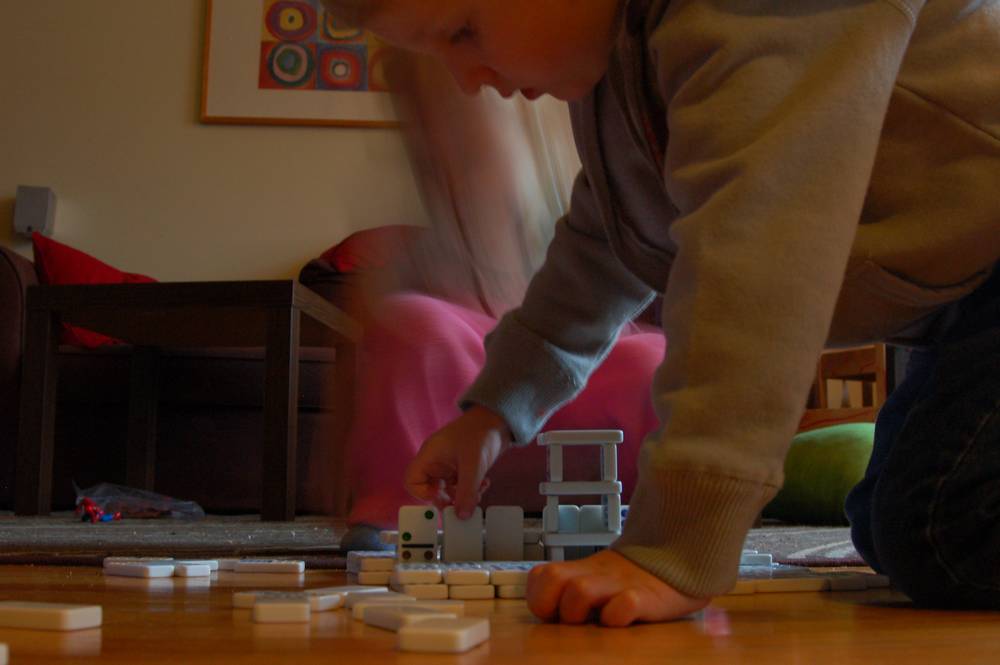 It's freakin' hard to build domino towers with a 2.5 year old's help.