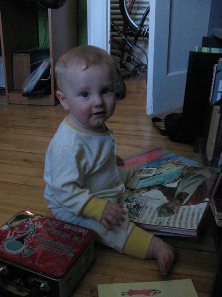 In the office there's a bookshelf that Raphie loves to pull books off of. Which is convienent because the computers are also in here so we can just plop him down on the floor.